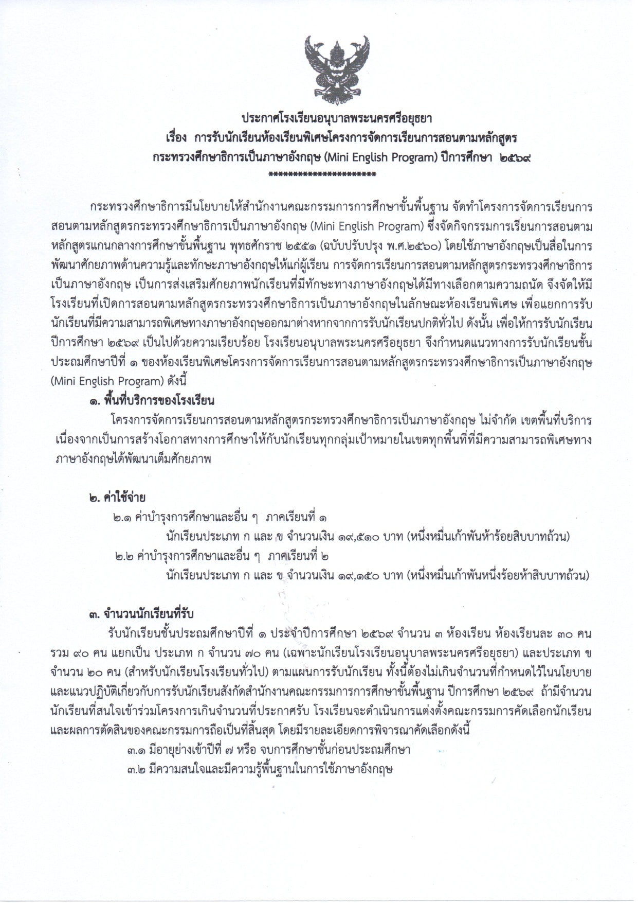 ประกาศโรงเรียนอนุบาลพระนครศรีอยุธยา