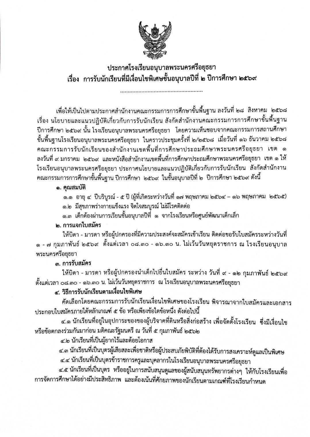 ประกาศโรงเรียนอนุบาลพระนครศรีอยุธยา เรื่อง การรับนักเรียนชั้นอนุบาลปีที่ 2 ปีการศึกษา 2569 (ฉบับที่ 2)