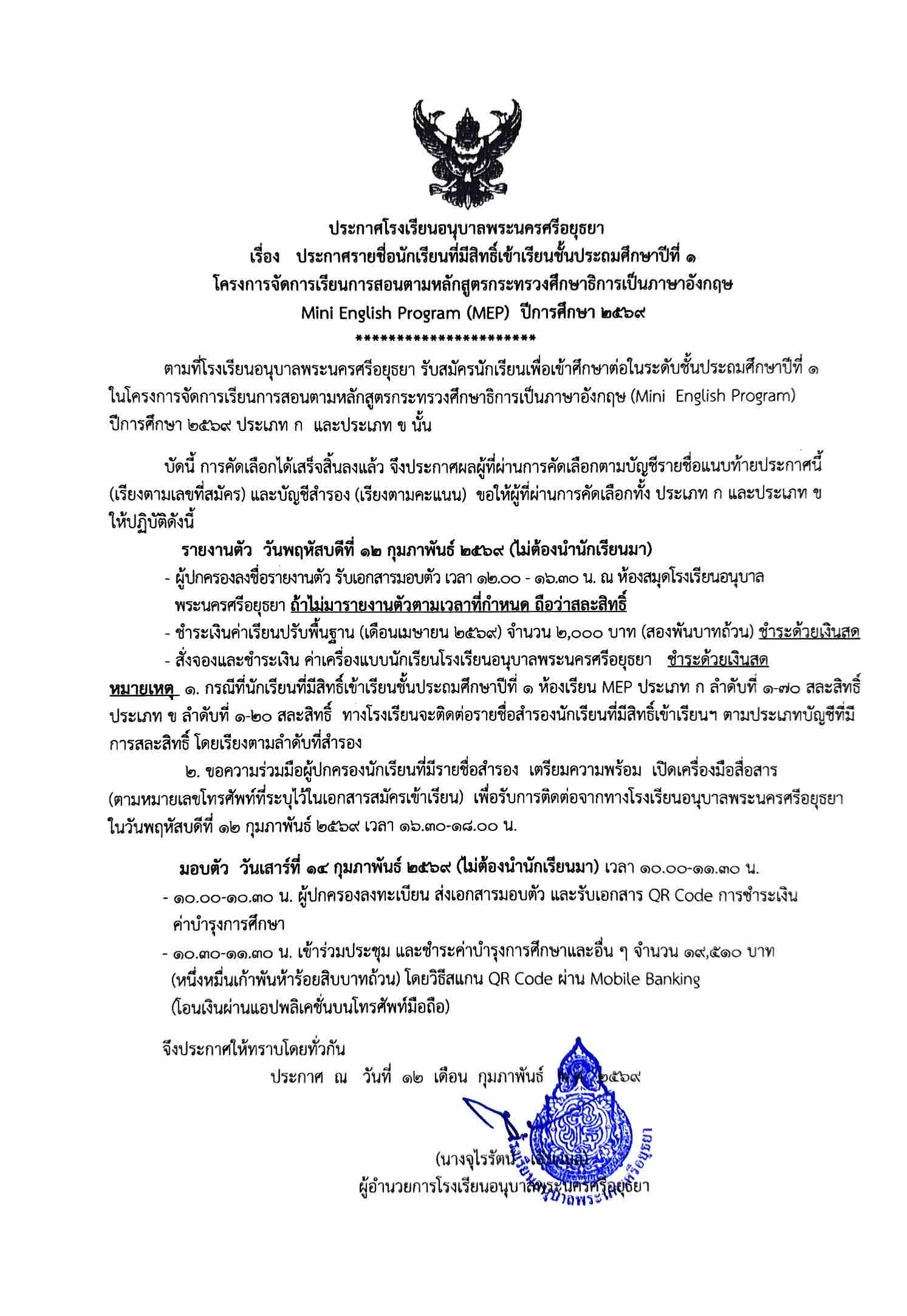 ประกาศรายชื่อนักเรียนที่มีสิทธิ์เข้าเรียนชั้นประถมศึกษาปีที่ 1 โครงการฯ Mini English Program (MEP) ปีการศึกษา 2569