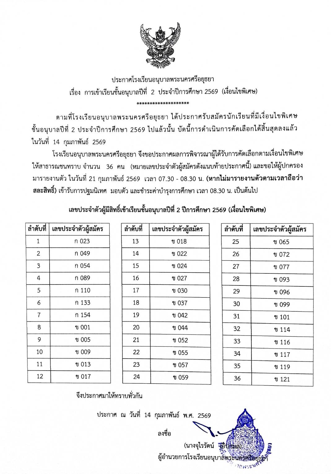 ประกาศโรงเรียนอนุบาลพระนครศรีอยุธยา เรื่อง รายชื่อนักเรียนที่มีสิทธิ์เข้าเรียนชั้นอนุบาลปี 2 ปีการศึกษา 2569 (เงื่อนไขพิเศษ) รายละเอียดดังเอกสารแนบ