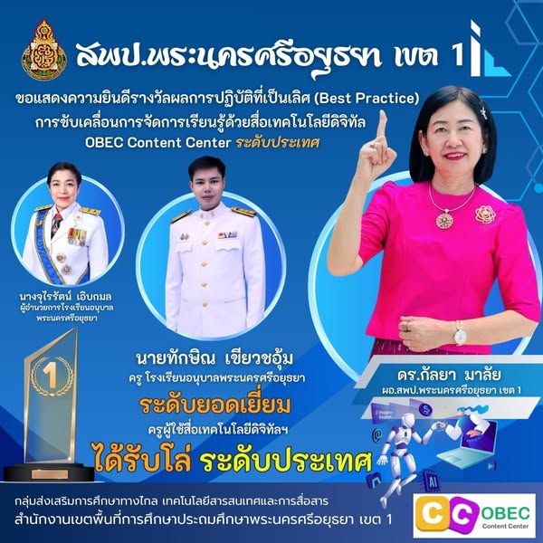 แสดงความยินดีกับ นายทักษิณ เขียวชอุ้ม ครูผู้สอนกลุ่มสาระการเรียนรู้ภาษาไทย ระดับยอดเยี่ยม ครูผู้ใช้สื่อเทคโนโลยีดิจิทัลฯ ได้รับโล่ ระดับประเทศ ผลการปฏิบัติที่เป็นเลิศ (Best Practice)