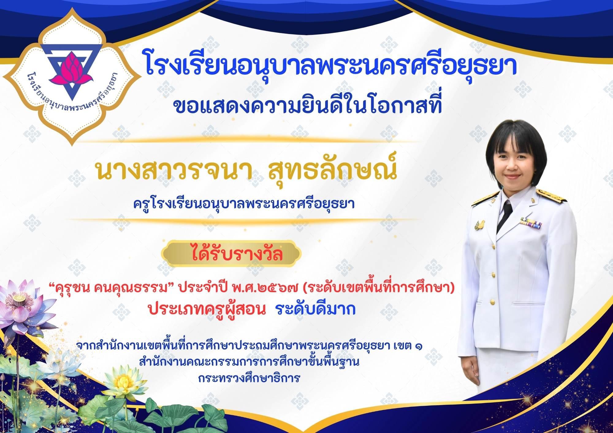 ชื่อผลงาน : รางวัล คุรุชน คนคุณธรรม ปี2567 สพป.อย.1 ประเภทครูผู้สอน ระดับดีมาก